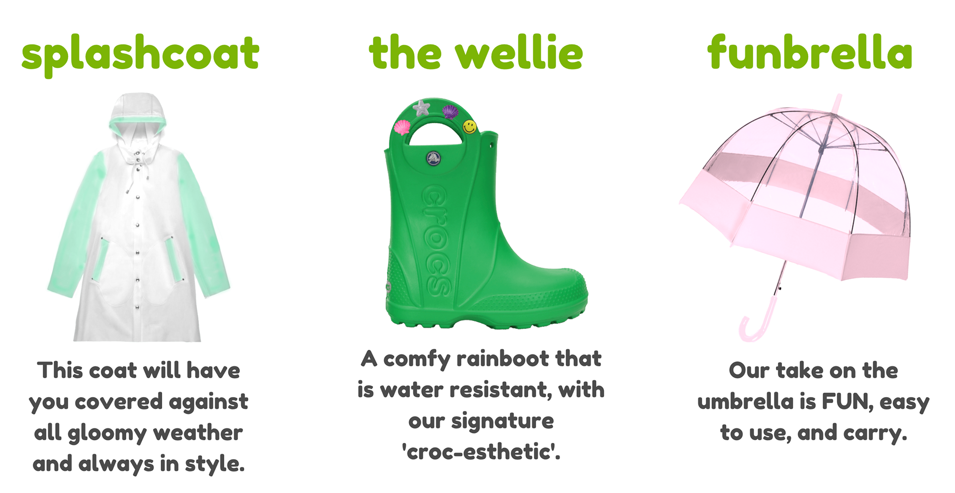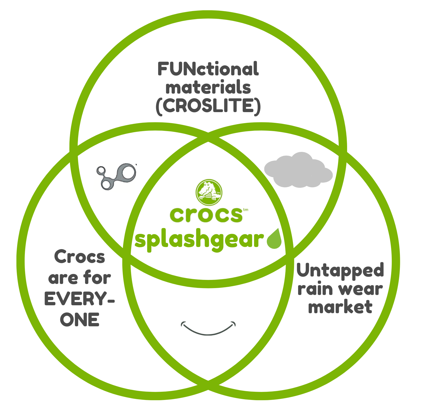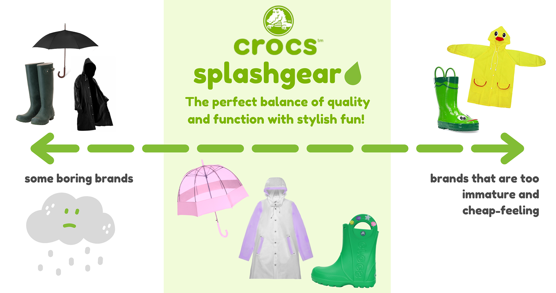 Crocs iconic 'Croslite' material and is already water resistant and the shoes are considered 'multi-use' or 'all-terrain'. These qualities align with a line of rain gear. So the Crocs brand becomes easily transferrable to these new market.