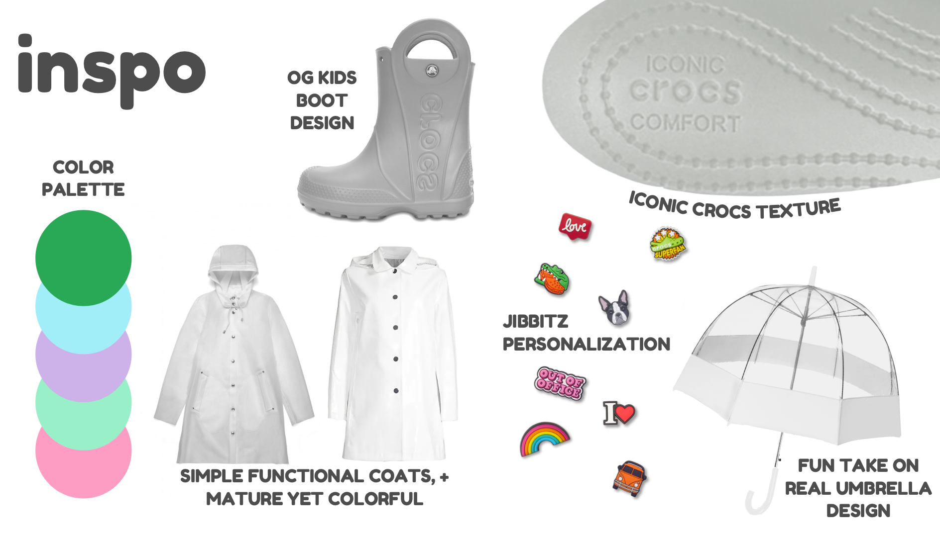 Considering the positioning opportunities and taking Crocs brand, I developed a moodboard to develop the 3 rain gear products. These products are informed by the opportunity and the brand's existing qualities as well as a diverse consumer range.