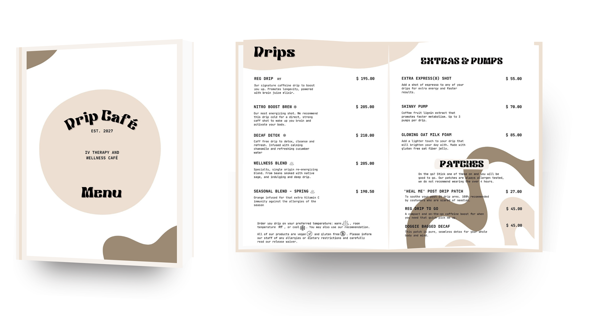 Through a futures wheel exercise and legacy mapping, I found coffee has a social side that has been deterred in recent years. Similarly, signals indicated people concern for their health in general and regarding caffeine consumption. I saw an opportunity to innovate the concept of cafés, forgoing on-the-go options with IV therapy sessions, which are trendy within the health and wellness realm. The menu takes from real IV pricing and health concepts, but could also read like a restaurant menu with food ingredients.